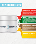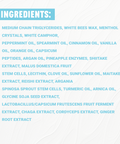 Medium Chain Triglycerides, White Bees wax, Menthol Crystals, White Camphor, Peppermint oil, Spearmint oil, Cinnamon Oil, Vanilla oil, Orange oil, Capsicum peptides, argan oil, pineapple enzymes, Shiitake extract, malus domestica fruit stem cells, Lecithin, Clove oil, Sunflower oil, Maitake extract, Reishi extract, Argania spinosa sprout stem cells, Turmeric oil, Arnica oil, Glycine Soja Seed Extract, Lactobacillus/Capsicum Frutescens Fruit Ferment Extract, Chaga extract, Cordyceps extract, ginger root extract